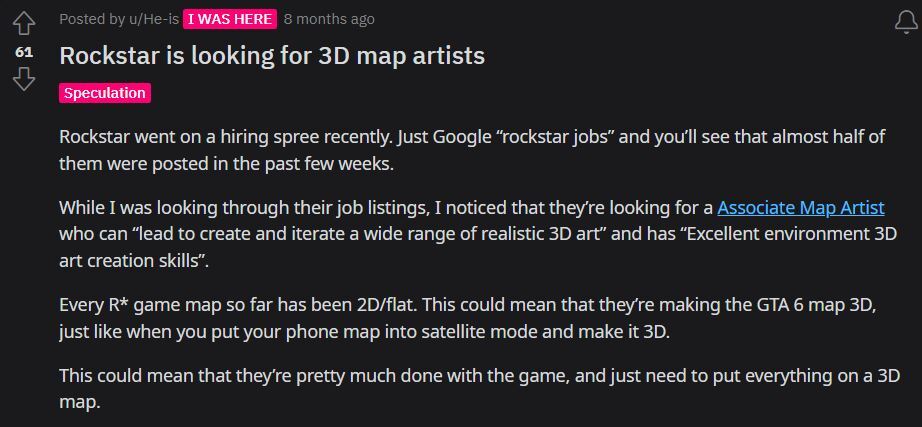 Reddit의 게시물에서는 Rockstar가 사실적인 3D 아트 제작과 관련된 일자리를 얻었다고 설명했습니다. 이 게시물은 아마도 Rockstar가 일종의 3D 지도를 만들려고 하고 있으며 게임과 지도의 실제 설정을 이미 완료했음에 틀림없다고 제안했습니다.