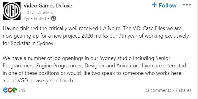 GTA의 세계를 VR로 걷는 것도 멋지지 않을까요? 글쎄, LinkedIn의 게시물에 따르면 Video Games Deluxe는 LA Noire VR에서 작업한 후 "새로운 프로젝트를 준비 중"입니다.