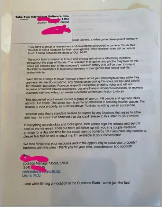 많은 사람들이 이에 대해 회의적이었습니다. 며칠 후 원본 포스터가 스카우트가 사우스 플로리다에 있는 지역 비즈니스의 내부 사진을 찍어달라고 요청하여 현지 비즈니스에 제공한 문서 사진을 찍고 Reddit에 또 다른 게시물 을 올렸습니다. 그들은 분명히 흥미로운 장소를 찾고 있었고, 편지에는 장소 스카우트 매니저가 서명했습니다.