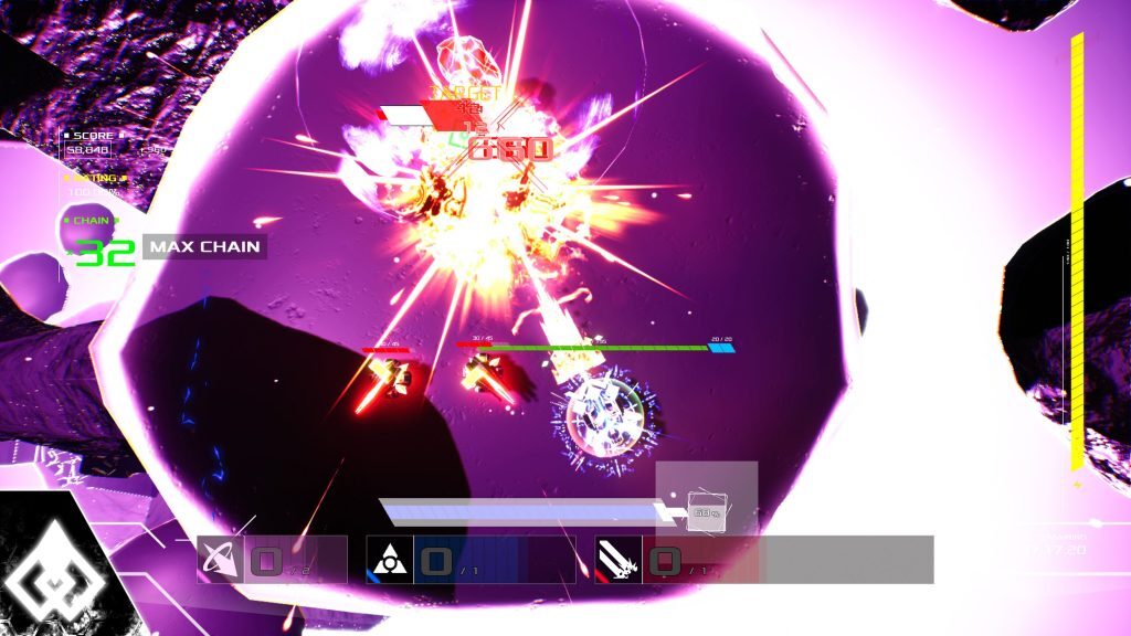 버튼으로 발사하면 가장 가까운 목표물에 자동으로 고정됩니다. 그것과 우주선의 관성 사이에서 처음에는 게임이 매우 이상하고 약간 지저분하게 느껴집니다.