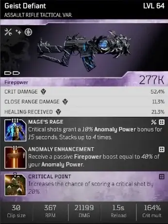 Outrider의 무기 가 사용할 수 있는 두 번째 무기 는 Geist Defiant 입니다. 이 무기는 레벨 64에서 52.4%의 치명타 피해를 입히고 11.3%의 근거리 피해를 입힙니다. 이것은 플레이어가 무기에 총알을 맞은 후 적을 하나씩 죽일 수있는 능력을 부여합니다.