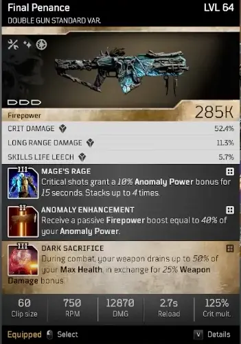 플레이어가 계속 사용할 수 있는 첫 번째 무기 옵션은 Final Penance 입니다. 이 옵션 은 레벨이 64를 넘을 때마다 52.4%의 치명타 피해를 입히므로 플레이어가 총을 쏘고 적을 전장에서 쓸모없게 만들 수 있습니다. 원거리 데미지도 11.3%로 설정되어 더욱 강력해졌습니다.