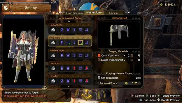 그러면 마스터 랭크 레이어드 아머를 제작할 수 있는 옵션이 나타납니다. 그러나 즉시 만들 수는 없습니다. 다른 Monster Hunter 게임과 마찬가지로 특정 재료를 먼저 파밍해야 합니다.