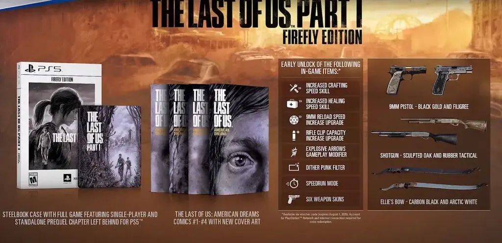 그러나 우리는 Last of Us 리메이크에 Firefly Edition을 가지고 있으며 당신이 알아야 할 많은 세부 사항이 있습니다. Firefly 수집가 버전에는 강철 책장, 추가 실제 물품 및 게임 내 아이템이 포함될 것입니다. 게임의 Firefly 에디션에는 "라스트 오브 어스: 아메리칸 드림스"라는 이름의 4권 만화도 있습니다.