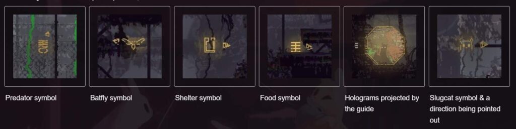 - Slugcat 기호: 가야 할 일반적인 방향을 알려줍니다.