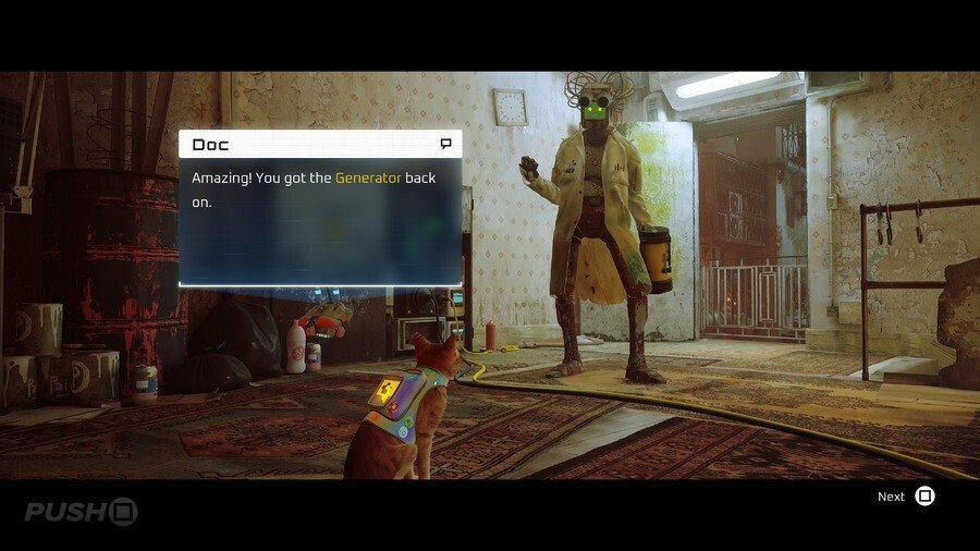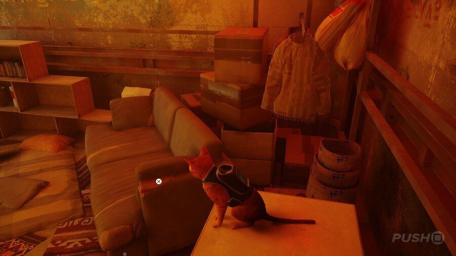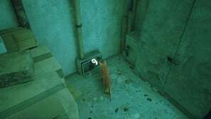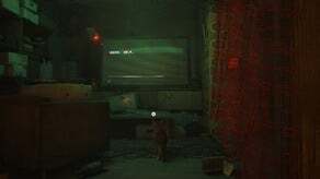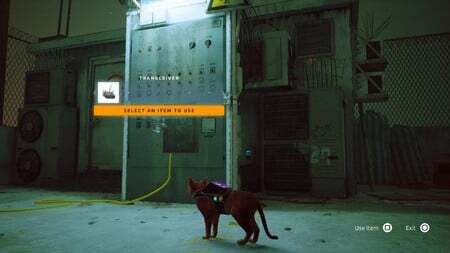 B-12를 만나는 컷신이 끝나면 그를 따라가서 열쇠를 잡으세요. 다음으로 그를 따라 하네스를 착용할 다른 스테이션으로 이동합니다. 당신은 몇 초 동안 서툴게 걷게 될 것입니다. 이것은 대부분의 고양이 주인들이 인식할 것입니다. 게임에서 인벤토리에 액세스하는 방법을 배운 후 플랫의 주요 부분과 왼쪽으로 이동한 다음 문을 엽니다.
