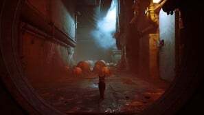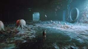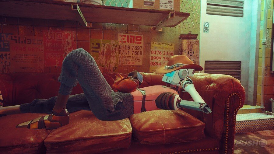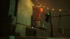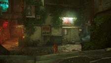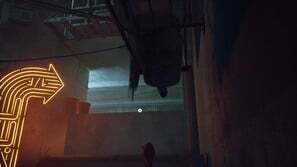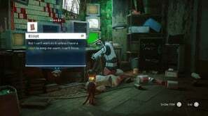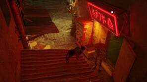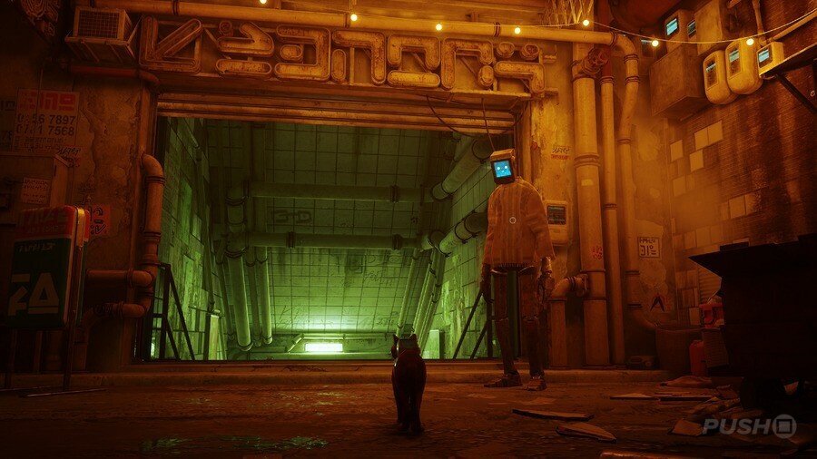 구슬 커튼을 통과하고 일부 보드 아래 오른쪽으로 이동하십시오. 양동이에 올라타 아래로 이동한 다음 왼쪽으로 이동합니다. 로봇이 당신을 놀라게 할 것입니다. 상호 작용하려면 삼각형을 누르십시오. 다음으로 쓰레기 수거통을 이용해 노란색 네온사인으로 향합니다. 골목길을 걸으며 컷씬을 감상합니다.