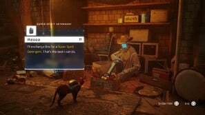 슈퍼 스피릿 세제를 얻으려면 할머니에게서 몸을 돌려 술집으로 돌아갑니다. 바 맞은편 건물 옥상으로 올라갑니다. 여기에서 로봇이 다른 로봇에게 페인트 통을 던지는 것을 볼 수 있습니다. 그들에게 접근하고 삼각형을 누르십시오. 시간이 되면 서클과 함께 야옹거리며 로봇을 산만하게 하면 로봇이 아래 거리에 페인트를 떨어뜨릴 것입니다.