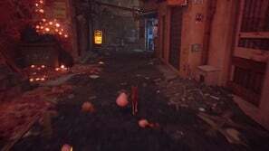 당신은 지금 그 우스꽝스러운 작은 짐승인 Zurks에게 쫓기고 있습니다. 실행하고 Zurks를 피하기 위해 R2를 누르고 있습니다. 너무 많은 것들이 당신에게 걸리면 당신은 죽을 것입니다. Circle과 함께 흔들어 제거하십시오. 이것은 선형 경로이므로 다른 쪽 끝으로 가십시오. 표지판이 거리를 안내합니다. 추격이 끝나면 오른쪽으로 몇 개의 계단을 올라간 다음 네온 사인을 따라 지붕과 플랫폼을 넘어갑니다. 밀어낼 수 있는 보드를 찾을 수 있습니다. 이렇게 하고 반대편으로 가는 다리로 사용하세요. 오른쪽 창을 통해 울타리가 쳐진 마당으로 뛰어내립니다.