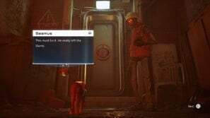 이제 Seamus의 장소로 돌아가서 고정 추적기를 보여주면 컷신이 시작됩니다. 추적기가 작동하면 Seamus를 따라 Doc을 찾아보십시오. 그는 당신을 봉인된 문으로 인도할 것입니다. 컷신이 재생되고 당신과 Seamus가 진행됩니다. 다음 지역에서 Seamus는 당신과 함께 갈 수 없다고 말하지만 Doc이 당신을 동맹으로 인식할 수 있도록 배지를 줍니다. 문이 열리면 통과하십시오.