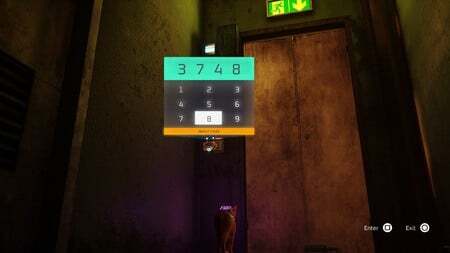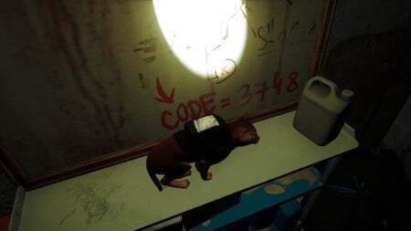 B-12의 손전등을 사용하여 다음 방을 밝힙니다. 열쇠로 잠긴 문이 있습니다. 오른쪽 방에서 페인트 통 뒤에 숨겨진 코드를 찾을 수 있습니다. 문으로 가서 코드를 입력하십시오: 3748 .