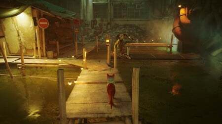 Stray에서 마음대로 뛰어다닐 수는 없습니다. 어딘가로 점프하려면 먼저 가장자리에 접근하고 원하는 착륙 지점 위에 X 버튼 프롬프트가 나타날 때까지 기다렸다가 점프 해야 합니다. 프롬프트가 표시되지 않으면 점프할 수 없으므로 다른 경로를 찾으십시오. 익숙해지는 데 오랜 시간이 걸리지 않으며 몇 번 해보면 실제로 꽤 직관적으로 느껴집니다. 또한 우아한 작은 고양이 같은 느낌을 줍니다.