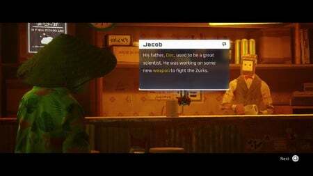 안으로 들어가 모모의 스툴에 올라 컷신과 대사를 진행합니다. 당신은 또 다른 아웃사이더인 즈발타자르와 연락을 취합니다. 즈발타자르는 그를 찾으려면 하수구를 통과해야 한다고 말합니다. 술집의 또 다른 로봇인 Seamus는 희망이 없다고 말합니다. 그가 실종된 또 다른 아웃사이더인 Doc의 아들임이 밝혀졌습니다. 그는 Zurks와 싸울 무기를 개발 중이었습니다. 당신은 Seamus를 찾기로 결심하고 그가 Doc을 찾는 것을 돕도록 합니다.