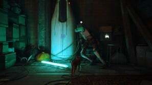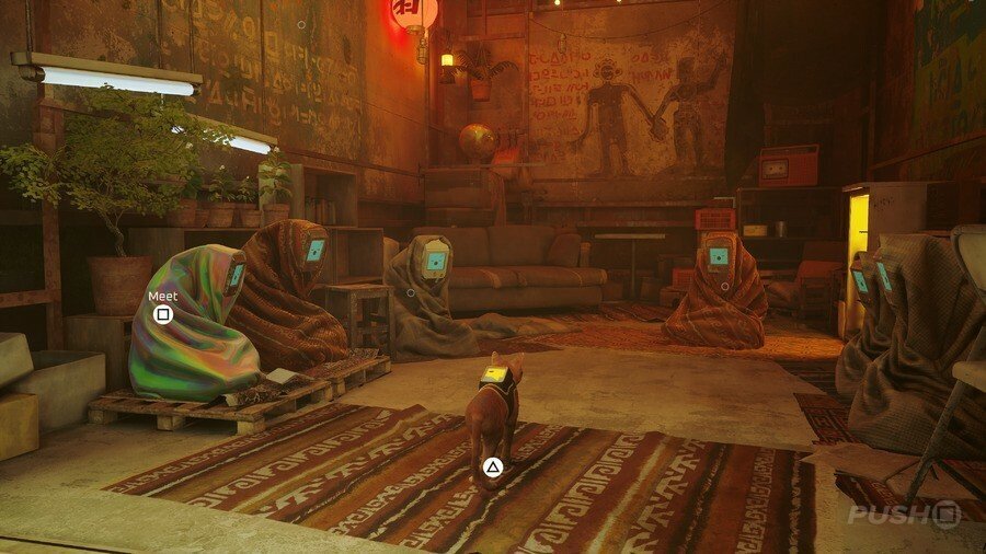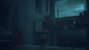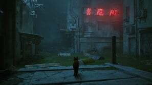 구슬 커튼을 통과하고 일부 보드 아래 오른쪽으로 이동하십시오. 양동이에 올라타 아래로 이동한 다음 왼쪽으로 이동합니다. 로봇이 당신을 놀라게 할 것입니다. 상호 작용하려면 삼각형을 누르십시오. 다음으로 쓰레기 수거통을 이용해 노란색 네온사인으로 향합니다. 골목길을 걸으며 컷씬을 감상합니다.