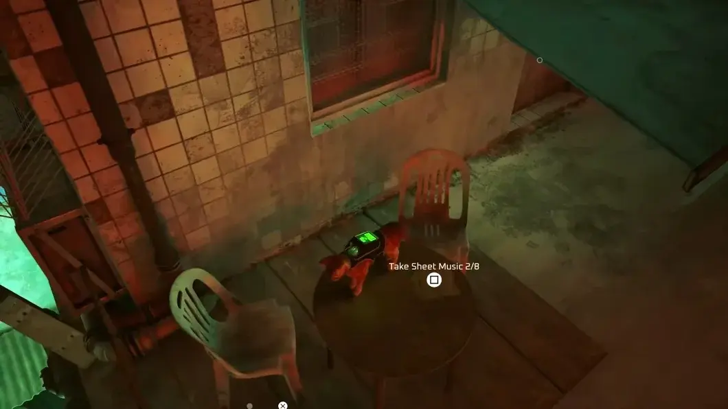 Stray의 두 번째 악보는 Clementine의 아파트 왼쪽에 있습니다. 먼저 바 위쪽으로 올라가 빨간 네온사인 방향으로 가야 합니다. 파이프 위로 점프할 때까지 계속 위로 향합니다. 이제 파이프를 사용하여 발코니로 들어갑니다. 플레이어는 테이블에서 두 번째 악보를 발견할 것입니다.