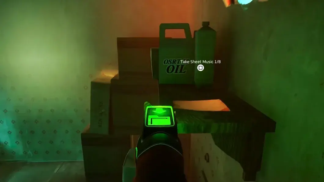 이제 금속 문을 찾고 막대를 통해 다음 방으로 이동하십시오. 플레이어는 선반 상단에서 악보를 찾을 수 있습니다.