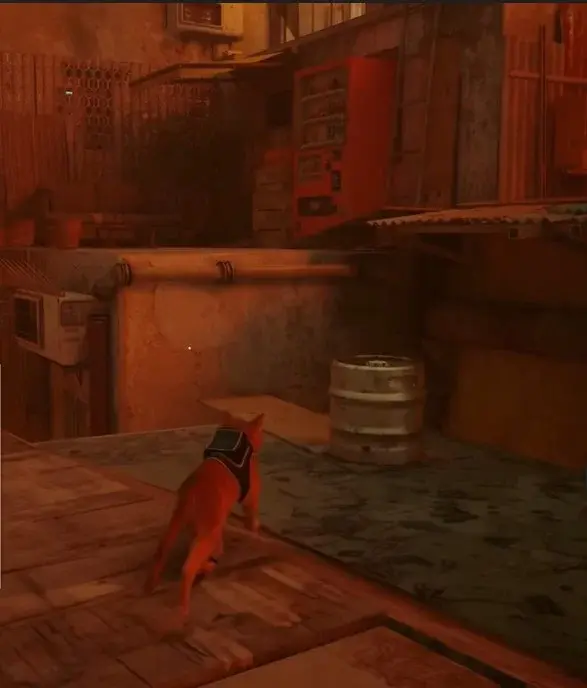 네 번째 자판기는 세 번째 자판기로 가는 길에 Stray에서 실제로 매우 쉽게 찾을 수 있습니다. 회색 배럴로 옥상으로 가는 길을 역추적하기만 하면 됩니다. 회색 배럴 아래에 나무 판자가 있음을 알 수 있습니다.