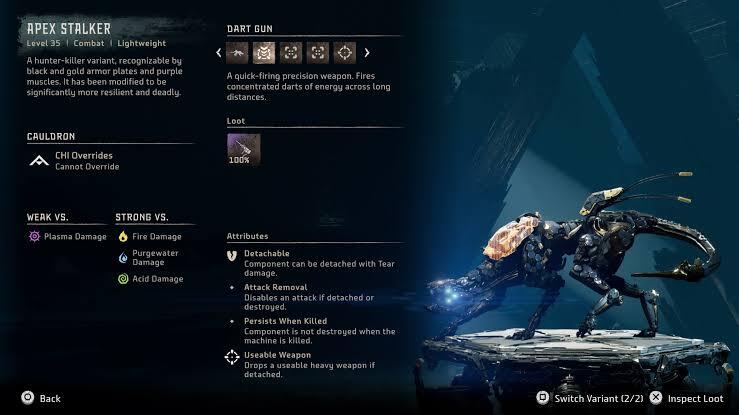 또한 Tear Damage를 사용하여 탈착할 수 있는 적의 탈착식 부품 중 하나입니다. 또한 분리하거나 파괴하면 능력을 비활성화할 수 있습니다. 분리하지 않으면 Apex Stalker로 파괴됩니다.