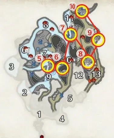 또한, 영역 9와 영역 12 사이의 영역에 쉽게 액세스할 수 있습니다. 그것은 당신이 몇 개의 흰색 정맥을 볼 수있는 영역이 있으며 그 장소가이 항목을 얻을 가능성이 가장 높습니다. 시간이 제한되어 있다면 파란색 노두에서 아이템을 거의 드롭하지 않으므로 검색하지 않는 것이 좋습니다.