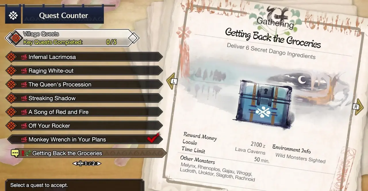 이 마을 퀘스트는 MHR의 비핵심 채집 퀘스트입니다. 게임을 완료하기 위해서는 핵심 퀘스트가 필요하기 때문에 추가 보상을 위한 것일 뿐입니다. 퀘스트는 레벨 4이므로 랭크 4가 잠금 해제되었는지 확인하십시오.