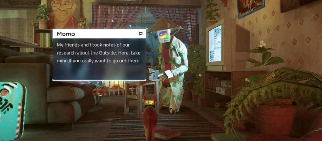 모모의 노트는 메인 스토리의 일부로 수집해야 하므로 피할 수 없습니다. 로봇 "가디언"에게 말을 걸면 지붕 위로 올라가 Momo와 대화해야 합니다. 플랫에서 Momo와 대화하면 자동으로 Notebook과 나머지 3개를 얻기 위한 미션을 얻게 됩니다.