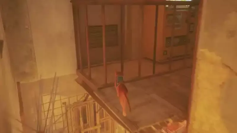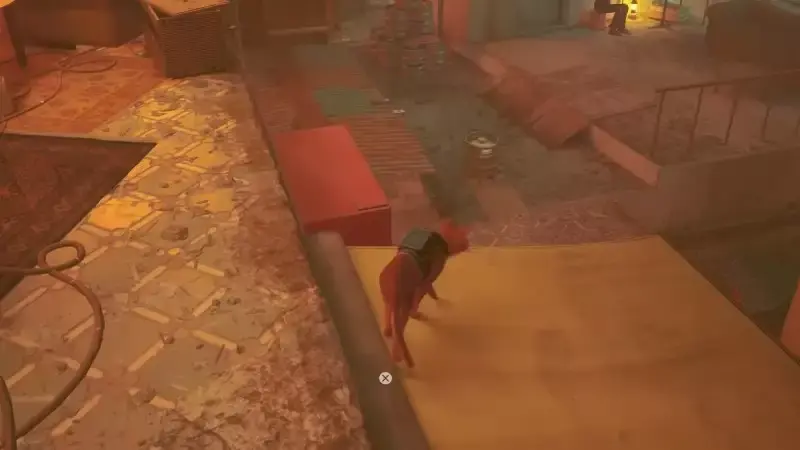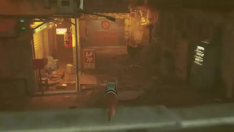 다시 내려가면 두 번째 음료를 발견한 위치로 이동합니다. 여기에서 계단을 내려가 왼쪽으로 계속 가세요. 여기 캐노피 아래에서 TV를 시청하는 로봇을 찾을 수 있습니다. 그 오른쪽에서 벽에 팬이 있는 빨간색 상자를 찾을 수 있습니다. 올라갈 수 있습니다. 금속 지붕을 따라 최종 자판기에 도달하십시오.