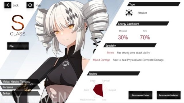 - 카레니나 엠버 는 에너지 계수가 PHY 30%, 화력 70%인 공격형 S급 캐릭터입니다. 근접(강한 영역 공격 능력을 가짐), 혼합 DMG(물리 및 원소 DMG를 처리할 수 있음)에 특화.