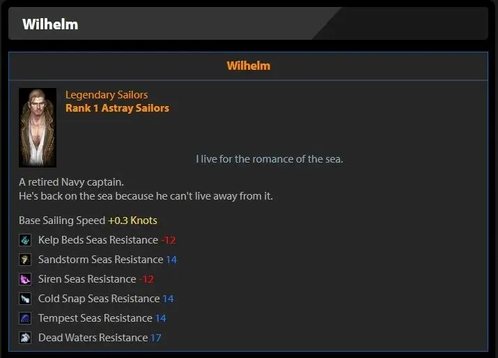 Wilhelm이 탑승하면 Astray Ship은 모래 폭풍 바다, 폭풍우 바다 및 한파에 대한 저항이 +14 증가합니다. 그게 다가 아닙니다. 선원은 사수에 대한 저항력 +17도 추가합니다.
