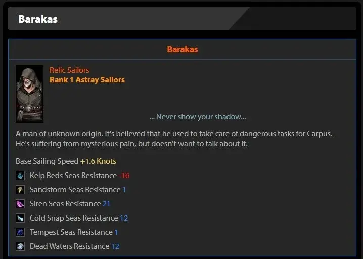 Astray Ship의 다음 승무원은 Barakas(유물)입니다. 배를 다시마 침대에 취약하게 만들었음에도 불구하고 Barakas는 면역에 +21을 추가하여 사이렌 바다에 대한 Astray의 저항을 돕습니다. 여기에서 너무 오래 방황하면 배가 기절할 수 있습니다. Barakas(유물)는 Astray Ship에 1.6 속도 노트를 추가하여 이를 더욱 돕습니다. 또한 선원은 냉해 및 사해 저항에 각각 +12를 추가합니다.