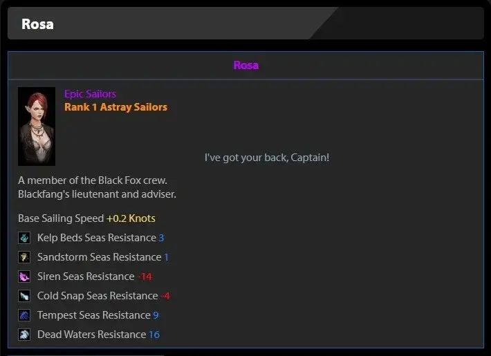 Rosa가 Astray Ship에 추가할 주요 기여는 +16 Dead Water 저항과 Tempest Seas에 대한 +9 저항입니다. 그러나 Siren Seas에 대한 -14의 큰 저항은 그녀를 Lost Ark의 Astray Ship 최고의 승무원 중 가장 소모적인 선원으로 만듭니다.