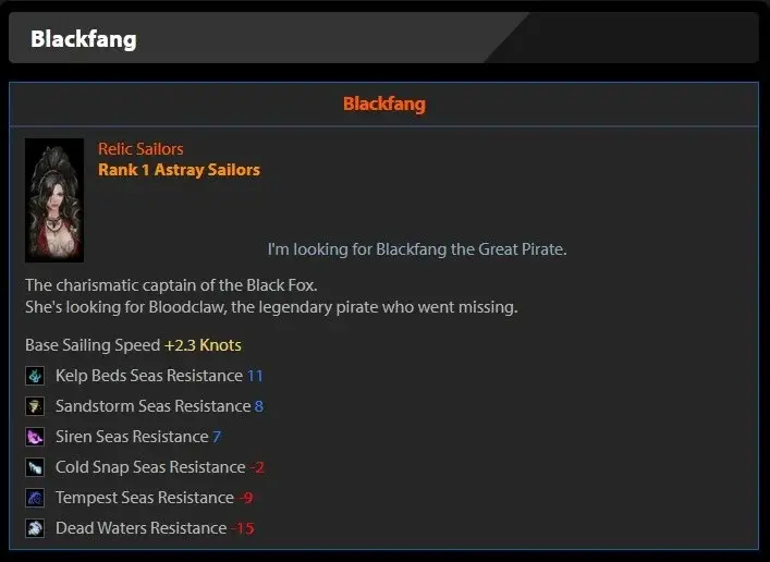 먼저 Lost Ark Best Astray 크루에서 Blackfang(Relic)이 있습니다. 이 승무원의 가장 큰 요점은 이미 빠른 Astray Ship에 2.3 속도 노트를 추가한다는 것입니다. Astray Ship을 상당히 빠르게 만드는 동안 Blackfang(Relic)은 배의 다시마 침대(+11)도 증가시킵니다. Astray Ship의 Sandstorm Seas 저항도 +8 증가합니다.