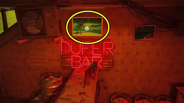 바 에서 카운터 위로 뛰어올라 벽에 걸려 있는 왼쪽 그림을 살펴보세요. 그것과 상호 작용하면 벽에서 떨어져 나갈 것입니다. 이것은 코드-1283을 드러낼 것 입니다.