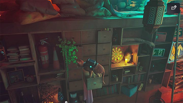 4개의 아이템 을 전달하면 다른 방이 잠금 해제됩니다 . 여기에서 비활성 로봇 근처에서 등반을 시작해야 합니다. 왼쪽 상단 선반에 도달합니다. 버려야 할 상자가 있습니다 .