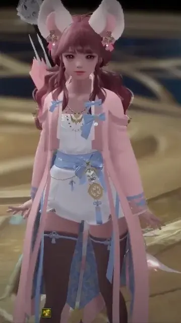 Lost Ark Aeromancer 스킨 에 포함된 마지막 요소는 상단에 흰색 모피가 있고 귀 안쪽에 분홍색 파스텔이 있는 토끼 귀입니다. 그리고 귀에는 작은 꽃들이 매달려 있습니다. 꼬리도 있고, 무기는 모두 블루와 핑크로 룩을 완성한다.