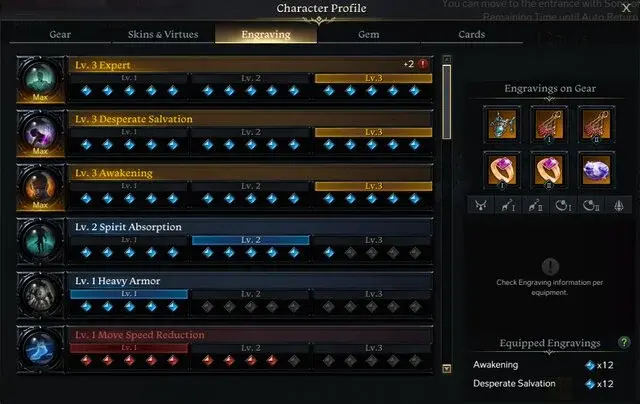 - 각성 : 캐릭터의 각성 스킬의 재사용 대기시간을 50% 단축 하고 초기 재사용 대기시간 이 활성화되기 전에 3회 추가 사용합니다.