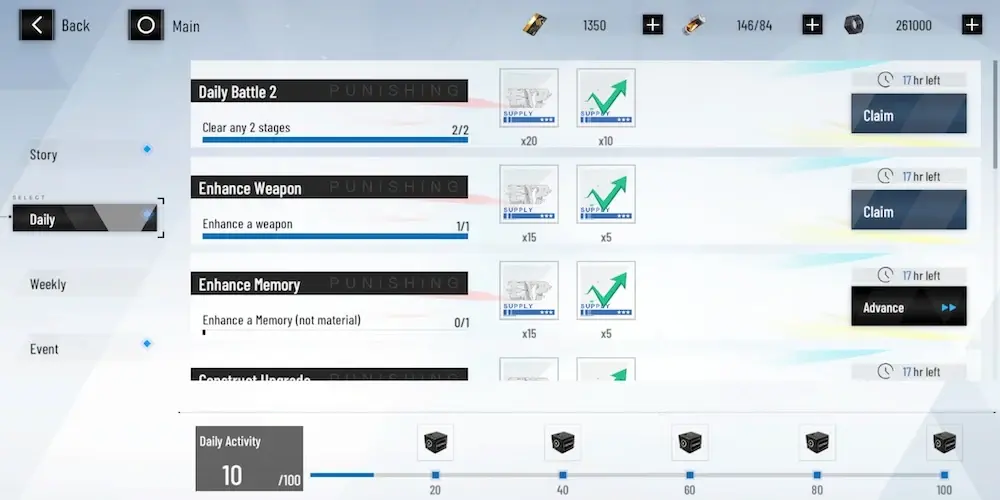 4가지 유형의 미션이 있으며 일일 미션, 주간 미션, 스토리 미션, 이벤트 미션이 있습니다. 각 세트에는 달성해야 할 목표 목록과 그에 따른 보상이 포함되어 있습니다. 시작하려면 일일 임무가 가장 쉽게 클리어할 수 있습니다. 이러한 임무를 일상의 지침으로 간주하고 분대 경험치와 활동 포인트를 얻을 수 있습니다. 활동 포인트를 얻으면 페이지 하단에서 상자를 잠금 해제할 수 있습니다. 각 목표를 달성하고 매일 최고의 보상을 받는 습관을 들이세요.