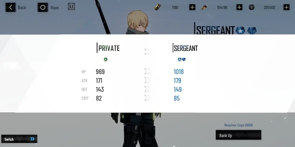 유닛을 강화하는 다음 단계는 승진입니다. 캐릭터를 다음 등급으로 승급시키기 위해 충족해야 하는 두 가지 기본 조건이 있습니다. 하나는 스토리 챕터 진행과 관련된 것이고 다른 하나는 유닛의 레벨입니다. 또한 Punishing: Gray Raven의 기본 통화인 Cogs를 사용하여 각 캐릭터의 등급을 올려야 합니다. 승진은 또한 캐릭터의 능력치 증가를 부여하고 등급에 별을 추가합니다.