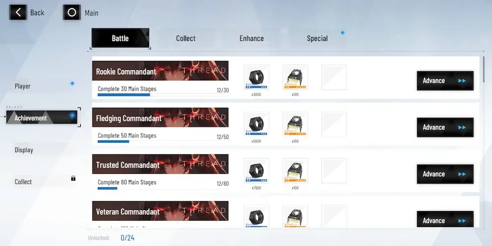 이러한 임무 외에도 Punishing: Gray Raven은 완전히 별도의 목록에 다양한 달성 목표를 보유하고 있습니다. 업적은 플레이어 세부 정보를 통해 액세스할 수 있으며, 메인 화면 왼쪽 상단에 있는 사령관 레벨을 눌러 볼 수 있습니다.