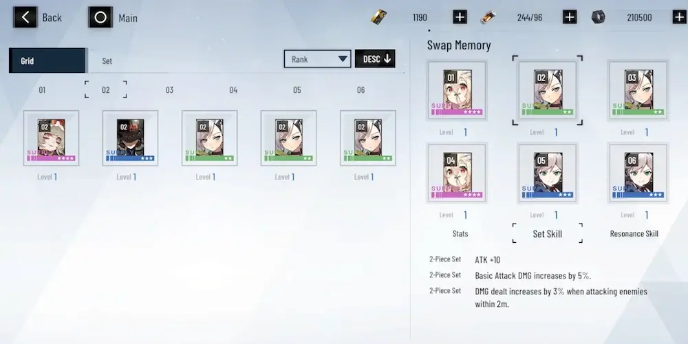 캐릭터 업그레이드 외에도 각 유닛은 무기와 6개의 메모리를 장착할 수도 있습니다. 무기는 캐릭터마다 다를 수 있으며 무기의 등급이 높을수록 확실히 더 나은 통계와 성능을 의미합니다.
