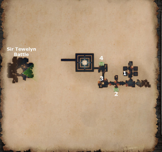 전투가 끝나면 북서쪽으로 이동하여 물약/기타 보물과 약간의 금이 들어 있는 빛나는 상자를 찾으십시오. 북동쪽으로 가면 인장, 트로피 및 약간의 금이 들어 있는 보물 상자가 있는 발코니를 찾을 수 있습니다(정확한 항목과 숫자는 다를 수 있음).
