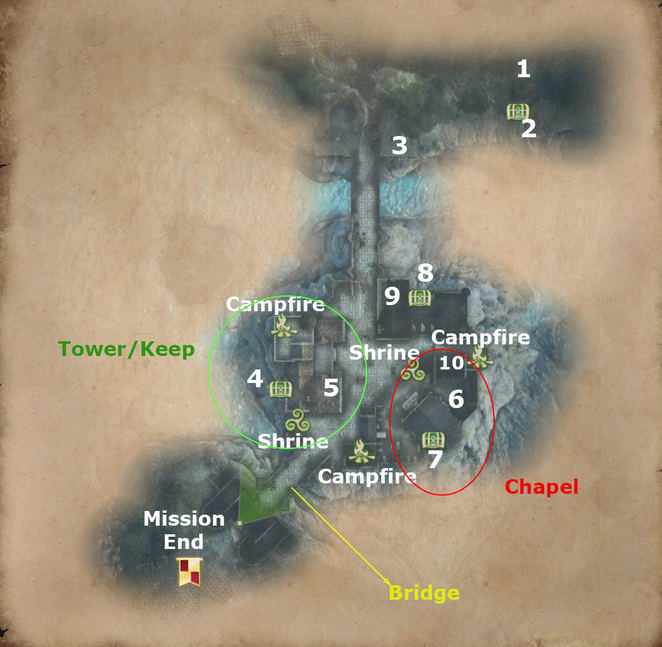 또한 체력/방어구를 복구할 장소가 필요한 경우 요새의 남동쪽에 모닥불이 있습니다.