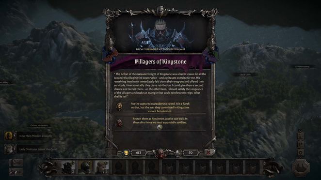 Pillagers of Kingstone을 선택하면 정당 또는 폭군을 선택하여 자신을 얼라인먼트 쪽으로 밀어붙일 수 있는 기회를 얻게 됩니다. (약탈자를 아끼기 위해) 폭군을 선택하면 +50 자원을 얻을 수 있습니다.