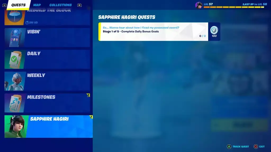 이전에 언급했듯이 Sapphire Hagiri 퀘스트를 통해 최대 1500 V-Bucks를 벌 수 있습니다. 당신이해야 할 일은 사파이어 하기리 퀘스트 라인을 진행하기 위해 일일 퀘스트를 완료하는 것입니다. 일일 퀘스트 3개를 완료하면 100 V-Bucks 등을 보상으로 받을 수 있습니다.