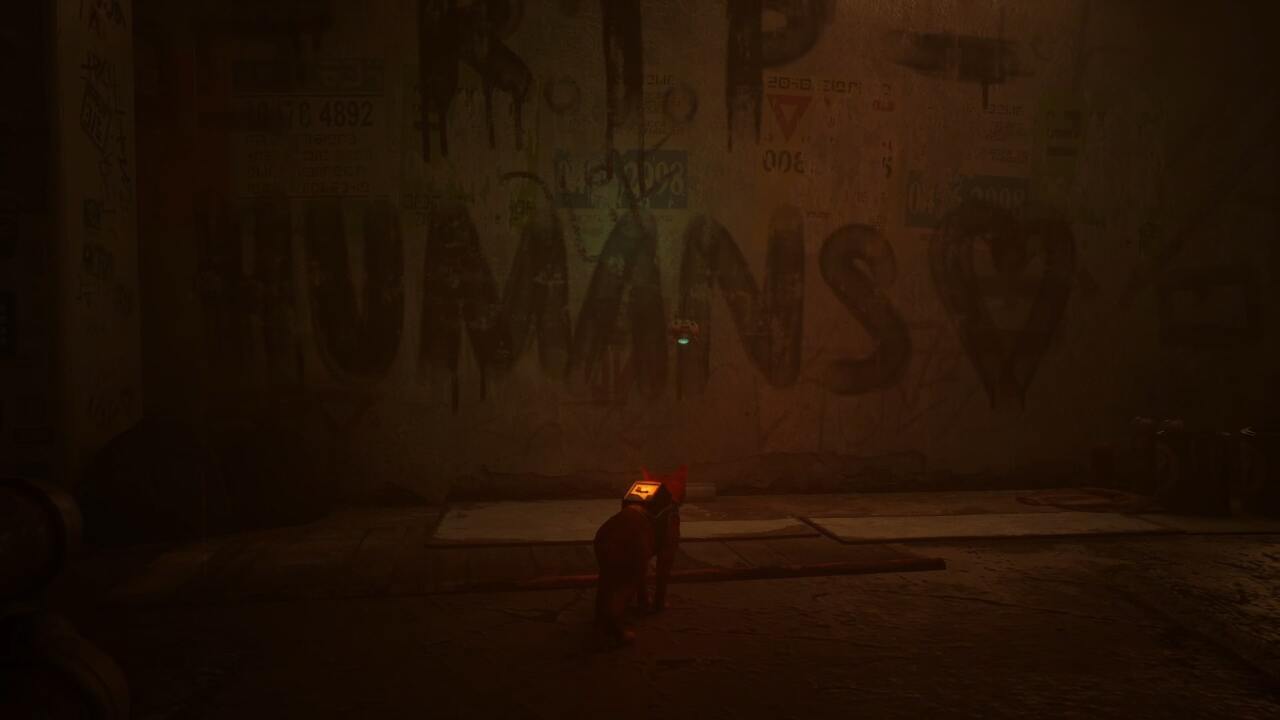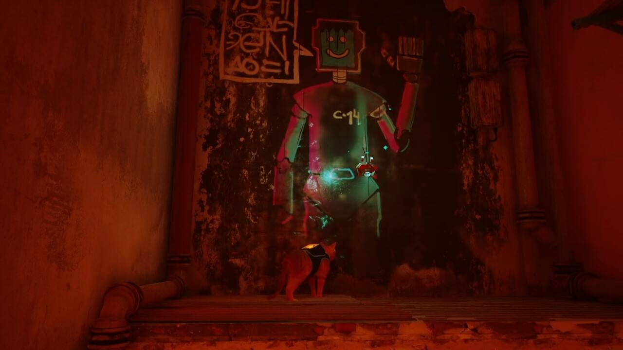 많은 스트레이 메모리는 게임의 광범위한 수직성을 활용해야만 복구할 수 있으며, 이것도 예외는 아닙니다. 음악가인 Morusque의 왼쪽에 있는 작은 골목으로 들어가 쓰레기통과 에어컨 장치를 확장하여 이 유쾌한 낙서를 찾으세요.