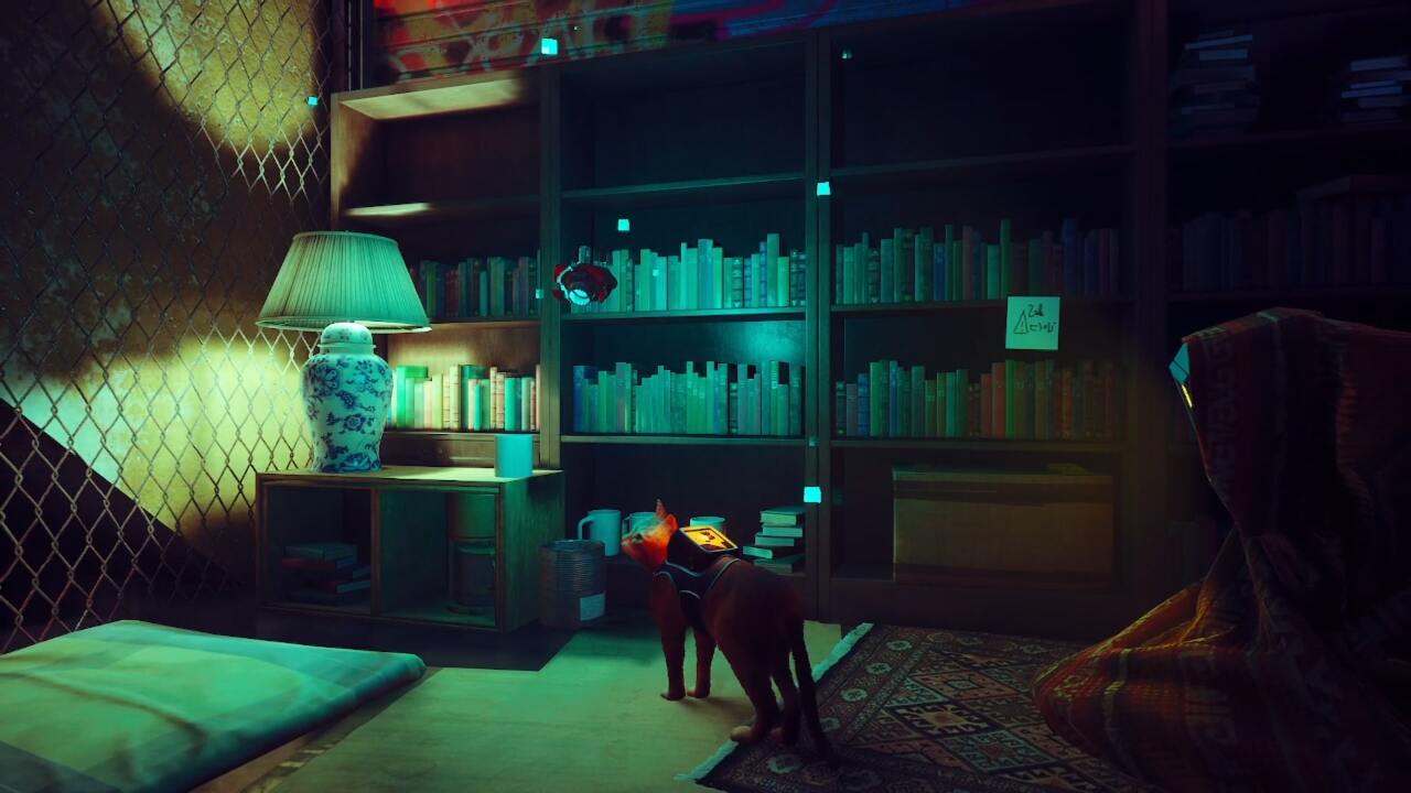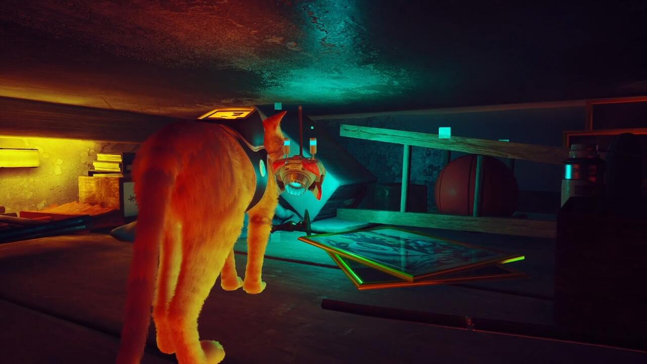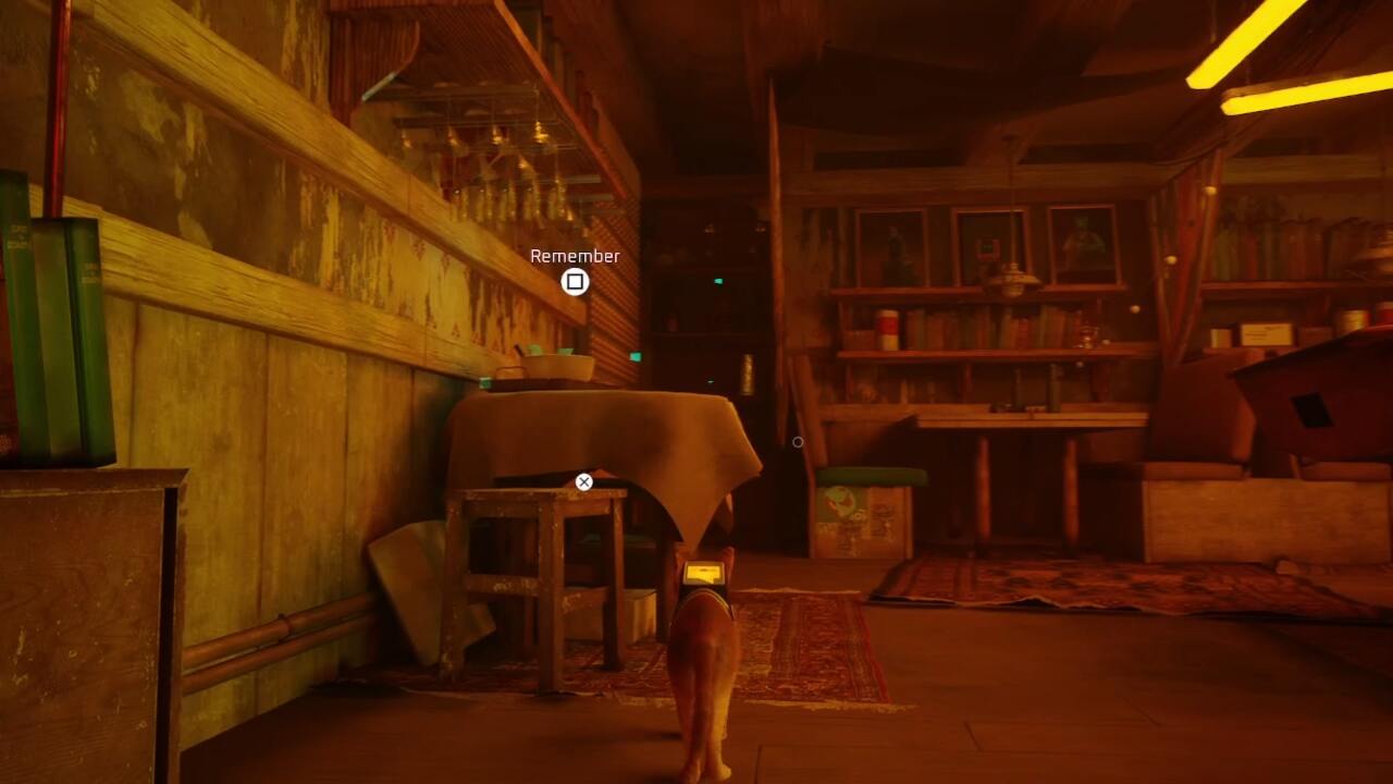 거기에서 소파 팔걸이에 있는 노란색 네온사인 위로 뛰어올라 이발소의 다락방에 도착합니다. 이 공간은 어둡고 협소하지만 사진 더미를 따라 푸른 빛을 따라가면 스트레이 메모리를 찾을 수 있습니다.