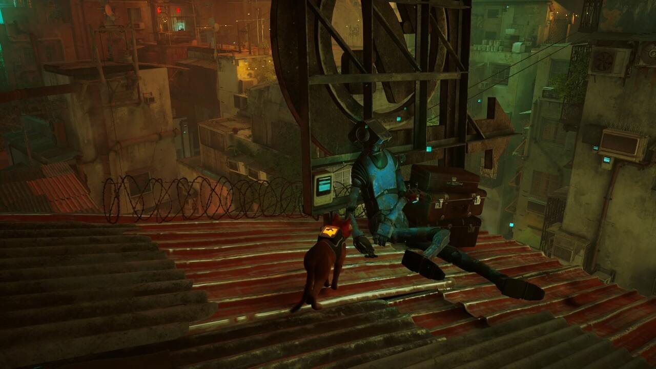 옥상으로 가서 Stray Super Spirit 세탁소 위로 페인트 통을 던지는 두 로봇 옆에 있는 양동이를 타 세요. 거기에서 경사 지붕을 바로 왼쪽으로 확장하고 깨진 표지판 뒤를 들여다보면 여행 가방 더미 옆에 쓰러진 로봇을 찾을 수 있습니다.
