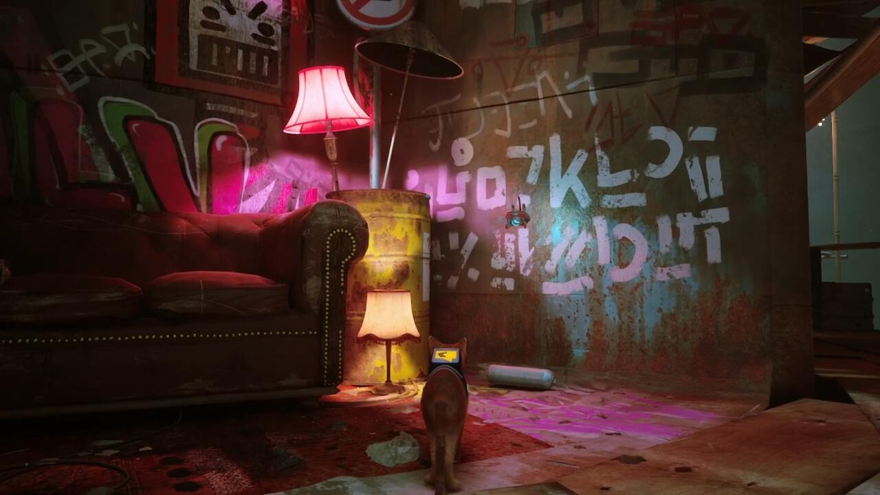 마작을 하는 로봇을 처음 만난 나무 위의 집 2층으로 돌아가 플랫폼을 따라가면 TV 앞에서 잠들어 있는 로봇을 찾을 수 있습니다. 이 부분은 낙서가 많은 편 인데 소파 오른쪽 벽에 붙은 하얀 글씨는 스트레이 메모리를 담고 있다.