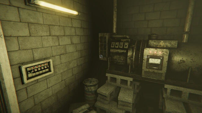 첫 번째 방에는 발전기와 퓨즈 박스가 있습니다. 첫 번째 스위치를 켜고(위쪽) 나머지 스위치를 끈 다음(아래쪽) 발전기를 두드려 활성화합니다. 다음 (얇은) 복도로 계속 가십시오.
