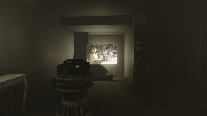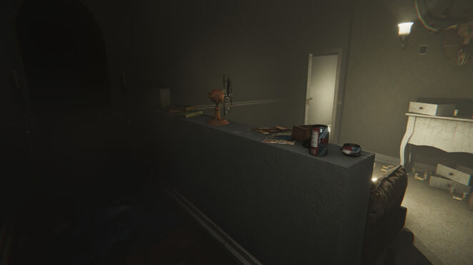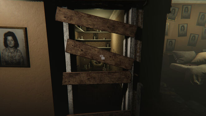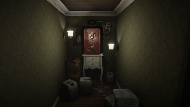 당신은 작은 거실로 보이는 곳에서 게임을 시작하고 문 뒤에서 아버지가 고함치는 소리를 듣습니다. 문 앞의 바닥을 보고 찾으십시오.썬박스. "LUCA V VI VII"라고 새겨진 조각을 찾을 수 있는 바닥을 살펴보기 위해 회전합니다. 잡아썬박스인벤토리에 추가합니다. 그것과 상호작용(PC에서는 마우스 가운데 버튼)하여 절단된 팔다리의 사진을 찾습니다.