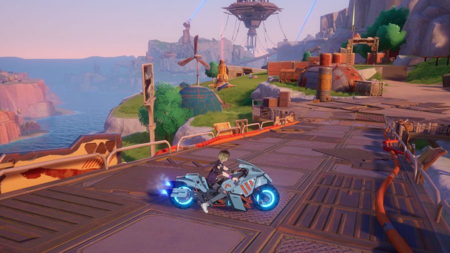 제트팩과 무엇보다도 버튼 하나만 누르면 쉽게 꺼내고 치울 수 있는 빛나는 자전거인 차량을 통해 탐색이 훨씬 쉬워집니다. 게임 후반부에 잠금 해제할 수 있는 다른 여러 이동 수단이 있지만, 첫 번째 이동 수단은 Hykros를 처음 방문할 때 제공되며 그 시점에서는 매우 환영합니다. 바이크를 제어하는 것은 터치 스크린 컨트롤을 사용하는 모바일에서 약간 까다롭지만 컨트롤러를 추가하거나 PC 빌드를 사용하면 훨씬 더 편안해집니다. 또한 Genshin Impact를 연상시키는 컨트롤과 스태미나 사용으로 대부분의 표면을 오를 수 있으며, 물 위를 횡단하도록 설계된 장착 가능한 호버보드가 있어 사용하기 좋습니다.